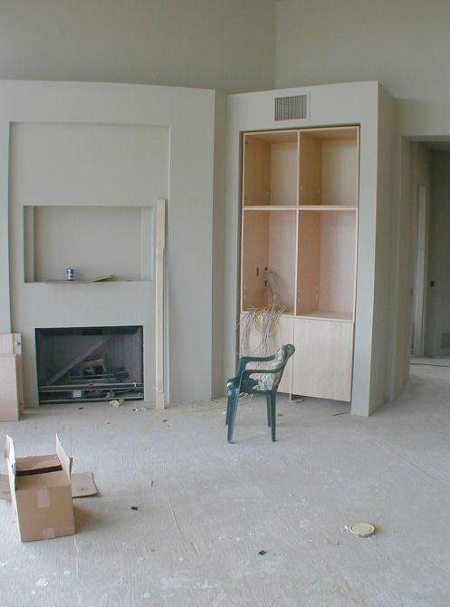 A view of the great room area with the fireplace and 'plasma hole' above it. You can see a few of the thousands of