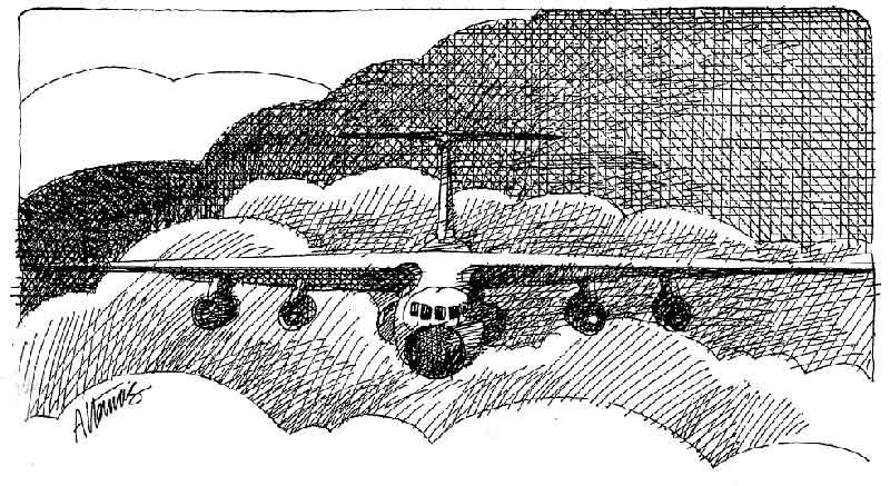 Some of the tension left him when the ADF needle reacted to the radio beacon and he was able to line the C-141 up with the still invisible runway. As Captain Hurd advised him they were at 600 feet, the ground appeared through an opening in the clouds. Suddenly they were out of the heavy stuff, and far ahead through the haze and a heavy smog, Rawlings saw the runway lights.