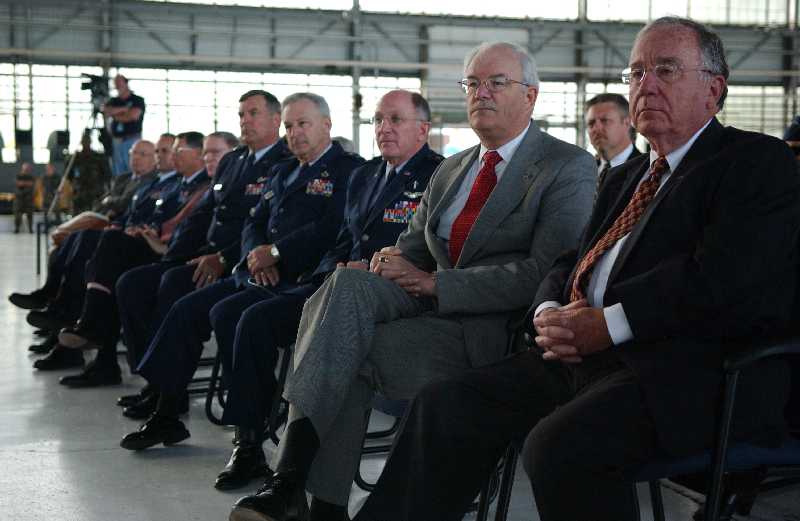 Secretary of the Air force Michael Wynne and other guests sit for the ceremony of the retirement of the 'Hanoi Taxi'. More than 120 former POW's, from the Vietnam War and their families will help the 445th Airlift Wing retire the Air Forces's last C-141C Starlifter, the 'Hanoi Taxi was the first aircraft to arrive in February 1973 to pick up the POWs returning to the United States following repatriation.(U.S. Air Force photo by SSgt Hector Garcia, 4th Combat Camera)