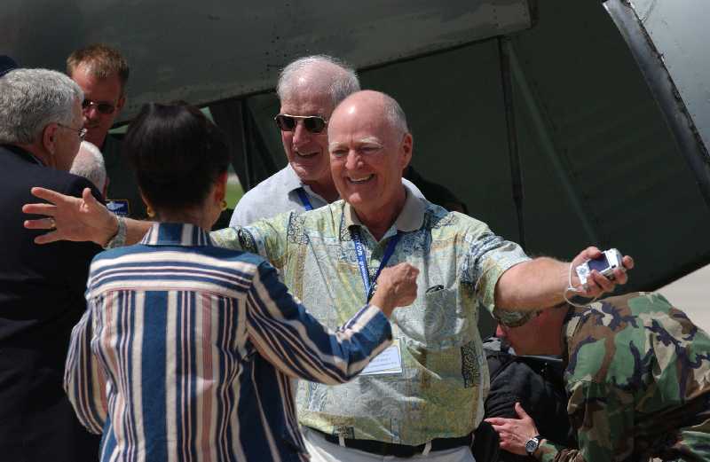 Former POW Mr. Hickerson is greeted by his wife after the retirement flight of the C-141 'Hanoi Taxi'. More than 120 former POW's, from the Vietnam War and their families will help the 445th Airlift Wing retire the Air Forces's last C-141C Starlifter, the 'Hanoi Taxi was the first aircraft to arrive in February 1973 to pick up the POWs returning to the United States following repatriation.(U.S. Air Force photo by SSgt Hector Garcia, 4th Combat Camera)