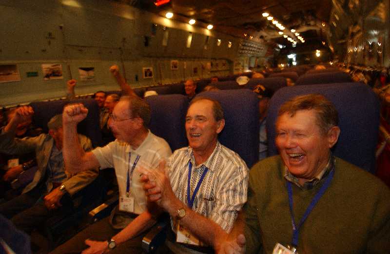 Former POW's, from the left, Captain Arv Chauncy, U.S. Navy (retired), Captain Ed Estes, U.S. Navy (retired), and Colonel Bob Barnett, U.S. Air Force (retired) let out a cheer as the C-141C they're aboard takes off from Wright-Patterson AFB during a POW reunion and rememberance flight. More than 120 former POW's, from the Vietnam War and their families will help the 445th Airlift Wing retire the Air Force's last C-141C Starlifter, the 'Hanoi Taxi' tail number 660177, during ceremonies at Wright-Patterson AFB, Ohio, May 5th and 6th 2006. The Hanoi Taxi was the first aircraft to arrive in Hanoi in February 1973 to pick up the POWs returning to the United States following repatriation. (U.S. Air Force photo by TSgt Rick Sforza, 4th Combat Camera)