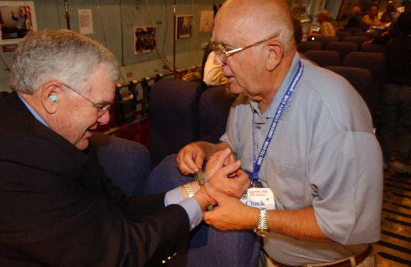 Former POW Colonel Chuck Tyler, right, USAF retired, shows Major Jim Marrott, USAF retired, a pair of manacles he smuggled out of the Hanoi Hilton during a POW reunion remembrance flight aboard the 'Hanoi Taxi.' Marrott was the pilot of the 'Hanoi Taxi.' More than 120 former POW's, from the Vietnam War and their families will help the 445th Airlift Wing retire the Air Force's last C-141C Starlifter, the 'Hanoi Taxi' tail number 660177, during ceremonies at Wright-Patterson AFB, Ohio, May 5th and 6th 2006. The 'Hanoi Taxi' was the first aircraft to arrive in Hanoi in February 1973 to pick up the POWs returning to the United States following repatriation.(U.S. Air Force photo by TSgt Rick Sforza, 4th Combat Camera)