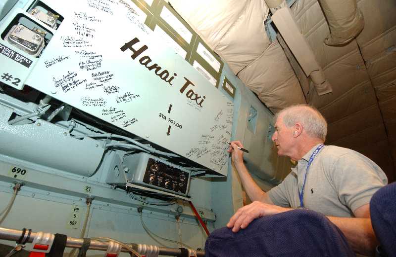 Former POW Cdr Tim Sullivan, USN retired, adds his name to the signatures of former POWs to an oxygen panel aboard the 'Hanoi Taxi' during a POW reunion remembrance flight before the retirement of the aircraft. More than 120 former POW's, from the Vietnam War and their families will help the 445th Airlift Wing retire the Air Force's last C-141C Starlifter, the 'Hanoi Taxi' tail number 660177, during ceremonies at Wright-Patterson AFB, Ohio, May 5th and 6th 2006. The Hanoi Taxi was the first aircraft to arrive in Hanoi in February 1973 to pick up the POWs returning to the United States following repatriation.(U.S. Air Force photo by TSgt Rick Sforza, 4th Combat Camera)
