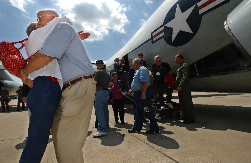 Former POW Chuck Tyler is met by his wife Doris following the POW reunion remembrance flight aboard the 'Hanoi Taxi' at Wright-Patterson AFB. More than 120 former POW's, from the Vietnam War and their families will help the 445th Airlift Wing retire the Air Force's last C-141C Starlifter, the 'Hanoi Taxi' tail number 660177, during ceremonies at Wright-Patterson AFB, Ohio, May 5th and 6th 2006. The Hanoi Taxi was the first aircraft to arrive in Hanoi in February 1973 to pick up the POWs returning to the United States following repatriation.(U.S. Air Force photo by TSgt Rick Sforza, 4th Combat Camera)