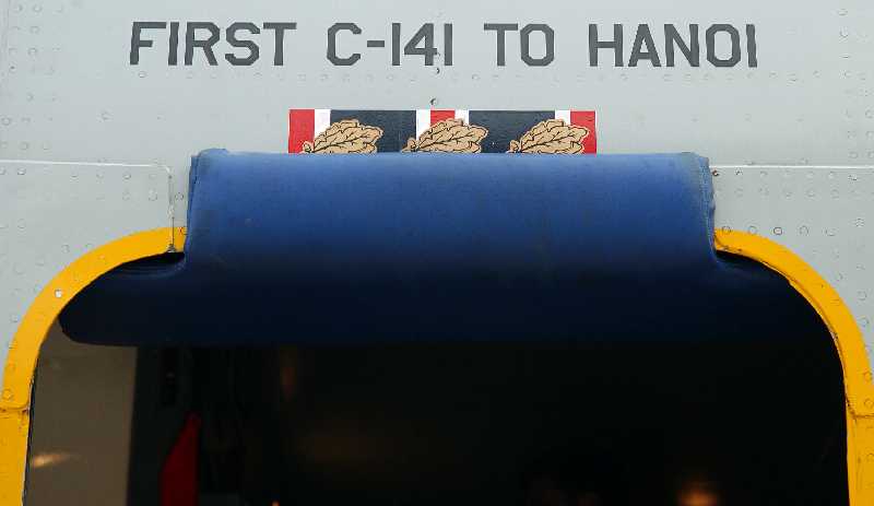 A reminder of this C-141C historical importance is stenciled above the crew entrance door. More than 120 former POW's, from the Vietnam War and their families will help the 445th Airlift Wing retire the Air Force's last C-141C Starlifter, the 'Hanoi Taxi' tail number 660177, during ceremonies at Wright-Patterson AFB, Ohio, May 5th and 6th 2006. The Hanoi Taxi was the first aircraft to arrive in Hanoi in February 1973 to pick up the POWs returning to the United States following repatriation.(U.S. Air Force photo by TSgt Rick Sforza, 4th Combat Camera)