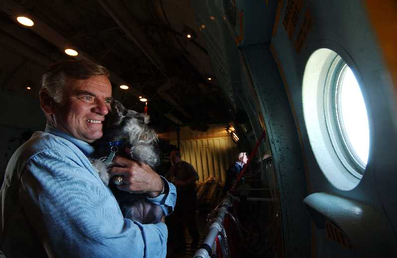 Former POW Ed Davis, a retired U.S. Navy Captain, holds his dog Sophia. Davis smuggled a puppy aboard a C-141 when he was repatriated. More than 120 former POW's, from the Vietnam War and their families will help the 445th Airlift Wing retire the Air Force's last C-141C Starlifter, the 'Hanoi Taxi' tail number 660177, during ceremonies at Wright-Patterson AFB, Ohio, May 5th and 6th 2006. The Hanoi Taxi was the first aircraft to arrive in Hanoi in February 1973 to pick up the POWs returning to the United States following repatriation.(U.S. Air Force photo by TSgt Rick Sforza, 4th Combat Camera)