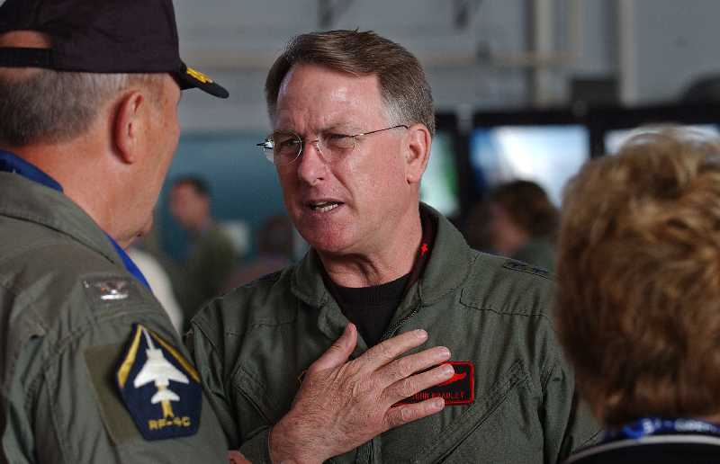 LtGen John Bradley, Chief of the Air Force Reserve, speaks with former POW Leroy Stutz during ceremonies at Wright-Patterson AFB for retirement of the C-141C Starlifter. More than 120 former POW's, from the Vietnam War and their families will help the 445th Airlift Wing retire the Air Force's last C-141C Starlifter, the 'Hanoi Taxi' tail number 660177, during ceremonies at Wright-Patterson AFB, Ohio, May 5th and 6th 2006. The Hanoi Taxi was the first aircraft to arrive in Hanoi in February 1973 to pick up the POWs returning to the United States following repatriation.(U.S. Air Force photo by TSgt Rick Sforza, 4th Combat Camera)