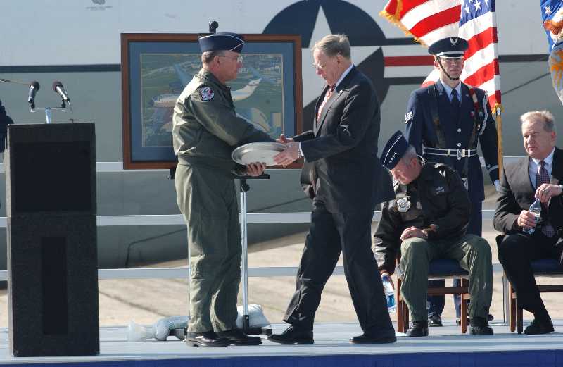 General Bradley presents the Pewter Plate commemorating 60 years of Reserves to General Metcalf during the C-141 turnover ceremony at the National Museum of the United States Air Force. The first aircraft (C-141 Starlifter) to return Vietnam prisoners of war to the United States makes its final landing Saturday May 6, 2006, at the National Museum of the United States Air Force. The C-141 :Hanoi Taxi' was the first aircraft to arrive in Hanoi in February 1973 to pick up the POWs held by the North Vietnamese. (U.S. Air Force photo by SSgt Hector Garcia, 4th Combat Camera)