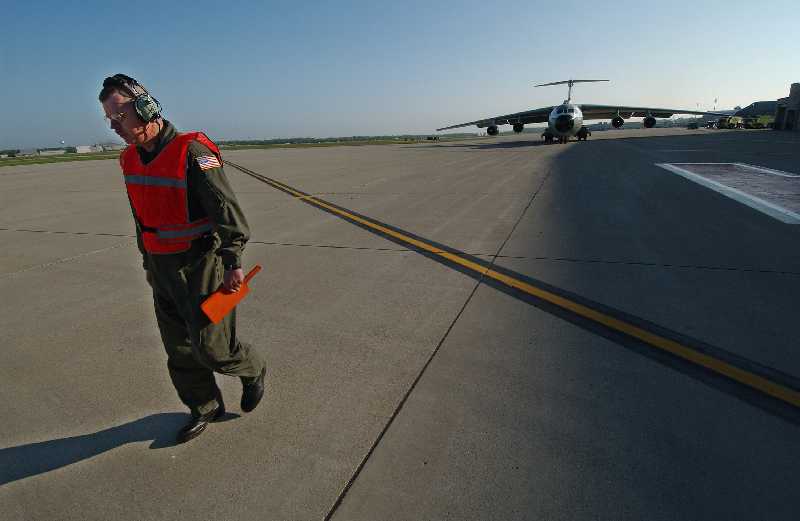 MSgt Henry Harlow says it was an emotional day as he makes his way in front of the 'Hanoi Taxi' to marshal the aircraft out for it's final flight. Harlow is an original member of 'Team 177' (the aircraft's tail number is 60177) who discovered the aircraft's past and helped bring to light it's historical past. The first aircraft, a C-141 Starlifter, to return Vietnam prisoners of war to the United States makes its final landing Saturday May 6, 2006 at the National Museum of the United States Air Force. The C-141 'Hanoi Taxi' was the first aircraft to arrive in Hanoi in February 1973 to pick up the POWs held by the North Vietnamese.(U.S. Air Force photo by TSgt Rick Sforza, 4th Combat Camera)