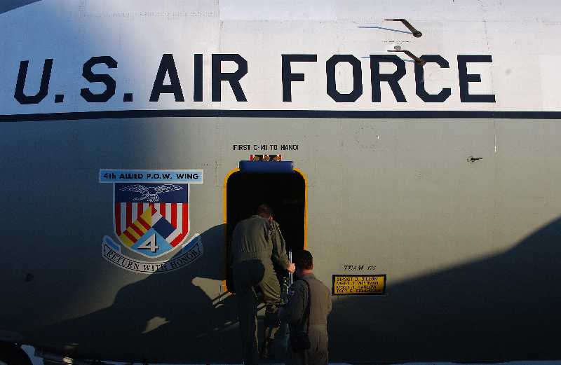 Former air crew members of the 'Hanoi Taxi' makes their way onboard for a final look before the C-141C Starlifter's final flight. The first aircraft, a C-141 Starlifter, to return Vietnam prisoners of war to the United States makes its final landing Saturday May 6, 2006 at the National Museum of the United States Air Force. The C-141 'Hanoi Taxi' was the first aircraft to arrive in Hanoi in February 1973 to pick up the POWs held by the North Vietnamese.(U.S. Air Force photo by TSgt Rick Sforza, 4th Combat Camera)