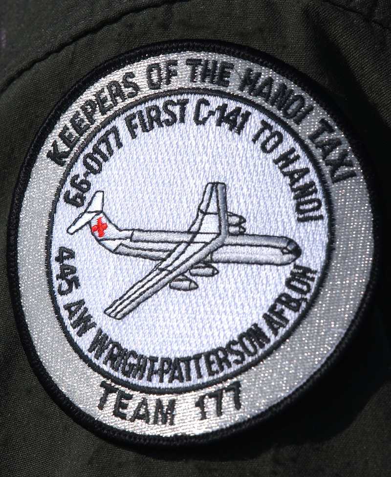 A patch worn by MSgt Henry Harlow signifies his involvement with the 'Hanoi Taxi.' Harlow says it was an emotional day as he helped ready the aircraft for it's final flight. Harlow is an original member of 'Team 177' (the aircraft's tail number is 60177) who discovered the aircraft's past and helped bring to light it's historical past.The first aircraft, a C-141 Starlifter, to return Vietnam prisoners of war to the United States makes its final landing Saturday May 6, 2006 at the National Museum of the United States Air Force. The C-141 'Hanoi Taxi' was the first aircraft to arrive in Hanoi in February 1973 to pick up the POWs held by the North Vietnamese.(U.S. Air Force photo by TSgt Rick Sforza, 4th Combat Camera)