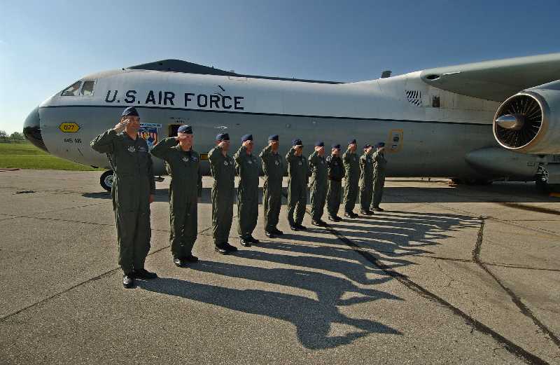 The last lift air crew for the 'Hanoi Taxi' renders salutes during the National Anthem at the turnover ceremony after landing landing the C-141C Starlifter at the National Museum of the United States Air Force in Ohio. The first aircraft, a C-141 Starlifter, to return Vietnam prisoners of war to the United States makes its final landing Saturday May 6, 2006 at the National Museum of the United States Air Force. The C-141 'Hanoi Taxi' was the first aircraft to arrive in Hanoi in February 1973 to pick up the POWs held by the North Vietnamese.(U.S. Air Force photo by TSgt Rick Sforza, 4th Combat Camera)