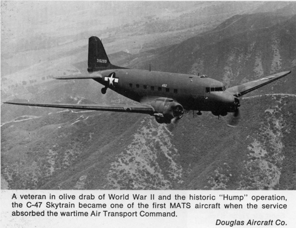 MATS' predecessors, the ATC (Air Transport Command) and NATS (Naval Air Transport Service), were born of necessity when the United States entered World War II. In December, 1941, the Army Air Corps Ferrying Command, which shortly became the ATC, had only eleven crudely converted B-24 Consolidated Liberator bombers, some eleven Boeing Clippers and Martin Flying Boats which the Air Corps had purchased from Pan American Airlines, and five TWA Boeing Stratoliners.