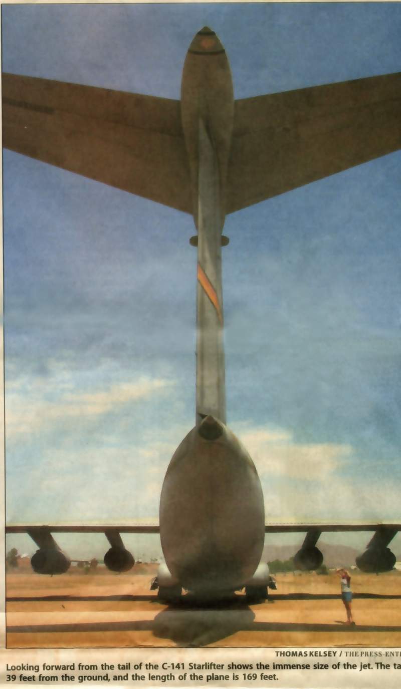 THOMAS KELSEY / THE PRESS-ENTERPRISE Looking forward from the tail of the C-141 Starlifter shows the immense size of the jet. The tail is 39 feet from the ground, and the length of the plane is 169 feet.
