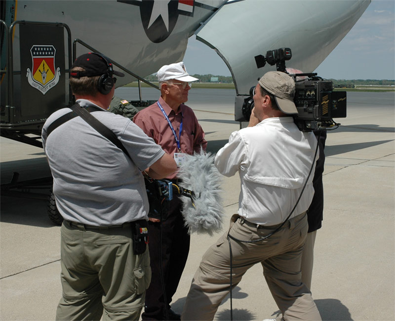 News media interviewing Jay Hess, one of the POWs who just got of the aircraft following his flight.