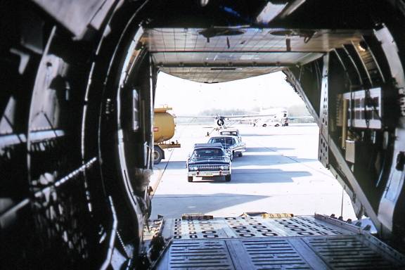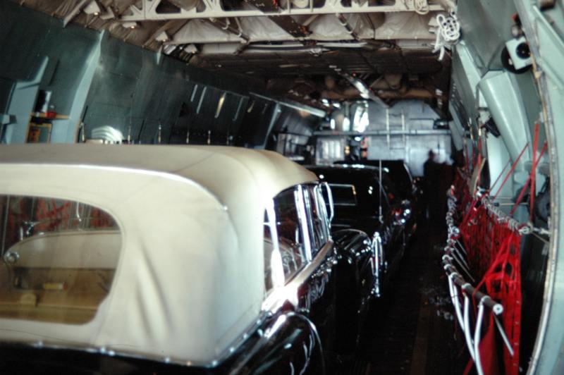 Ford and GM were both represented. The first onboard was the big Lincoln sedan. All of them had huge self-sealing tires and five-ply windows, which helps explain why they each weighed in at 12,000 lbs. The second was the black Caddie sedan, followed by my favorite; an older tan Cadillac 4-door-convertible with running boards. You new guys, ask your father about running boards. And, as with ALL the really special stuff we ever hauled, this cargo came with guards; four secret service, with automatic weapons for good measure.