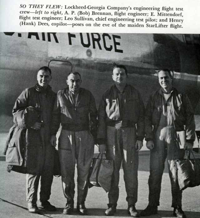 "Don't you worry," said Sullivan, a big, long-headed, plain-spoken Californian, an ex-Navy pilot who describes himself as "just a big dumb Irishman with a lot of luck." "I've got a personal, built-in flight instrument that tells me when it's go or no. That afternoon, with Hammond, Wagner, and several hundred engineers and others who had gotten wind of what might happen looking on from the tower and the flight line, Leo Sullivan taxied StarLifter #1, T-tail 61-2775, to the head of the 10,000-foot runway at Dobbins Air Force Base. Beside him in the right-hand seat was engineering test pilot Hank Dees, a Ten-nessean by birth. Graduated from Auburn University, Alabama, in aeronautical engineering, he also was a graduate of the Air Force Test Pilots School. At the flight engineer's console was a cheerful Irishman named Bob Brennan, educated in England and a long-time flight engineer with Imperial Airways before it became BOAC. Backing him up as test-flight engineer was E. "Mit" Mittendorf, a Texan.