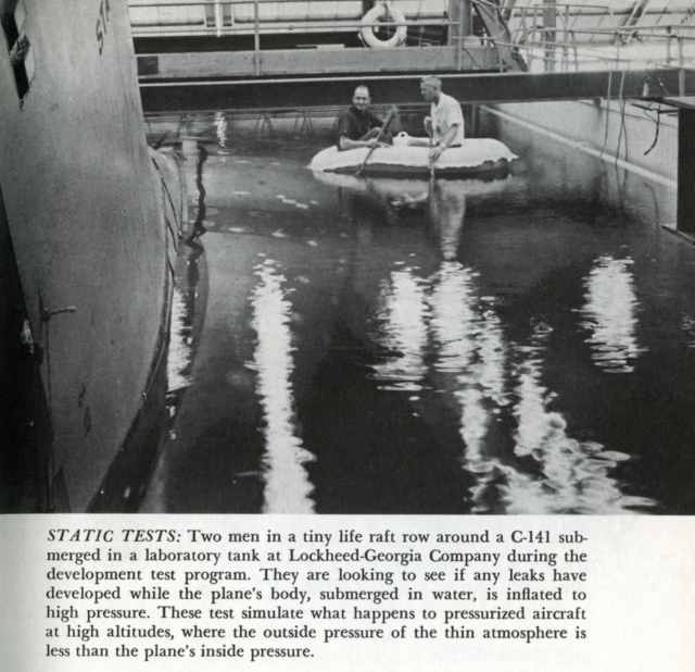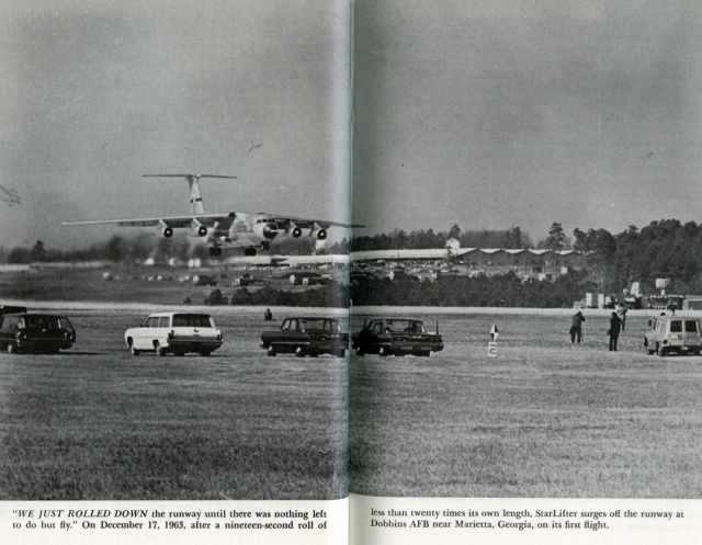 In this kind of testing, failures are expected, for it is the purpose of static testing to discover points of weakness on the ground, under controlled conditions, where no lives are at stake. The StarLifter, in the course of its development testing, had its share of failures, comparable to those that afflicted its stable-mate, the C-5, later on. They attracted no public attention at the time, however, for the mood of the nation in 1963 was not one of rancor toward the military as it was in 1969. There was little public outcry, for example, and no Congressional investigation when a StarLifter wing strut broke too soon in static tests, and ramp and cargo doors blew open under pressure testing. A petal door, one of the outer clamshell doors that give the plane its smooth configuration aft, fell off over Rome, Georgia, during yaw tests, and the flaps, when deflected, caused fierce buffeting. The steering column, which worked fine, had to be redesigned because it was too complicated to manufacture. Similar bugs crop up in every new aircraft, and Chuck Wagner and Max
