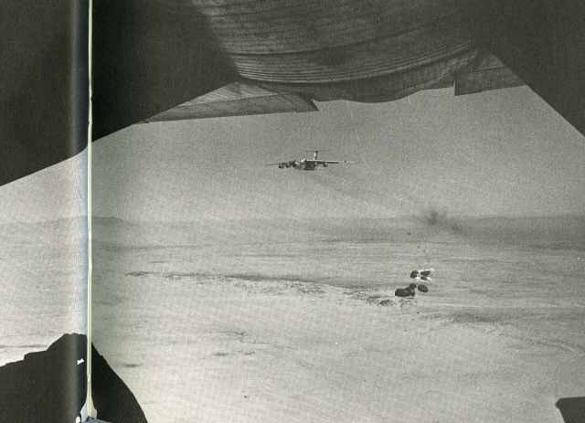FLIGHT TESTS: Water sprays back (above) from a KC-135 jet tanker onto the nose of a C-141 to produce actual icing conditions in flight. In a performance test(below) a StarLifter sets an unofficial world record by dropping more than 70,000 pounds of simulated cargo in one flight. Its teammate, the C-5, later broke this record by releasing 100,000 pounds on one flight.