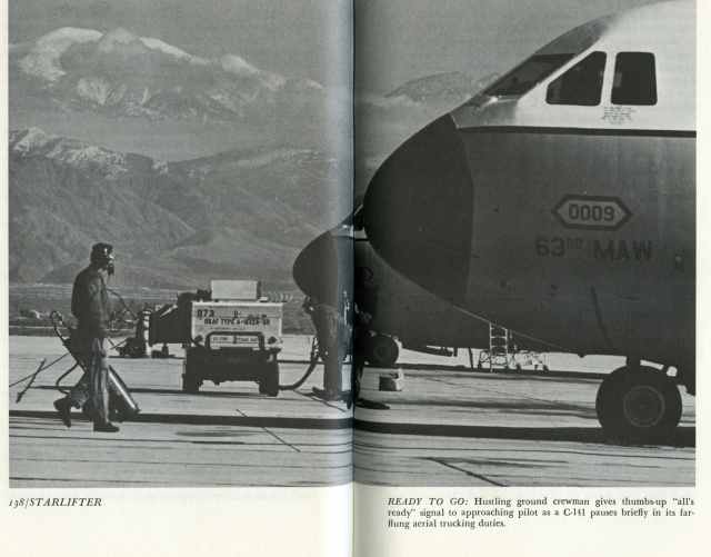 Bar hours that ignore the needs of wayfarers are about the only complaint the crewmen file against the huge operation at Elmendorf, jump-off point for the NorPac flights. In winter, Hercules aircraft of the 54th Weather Reconnaissance Squadron seed the air above the fog-shrouded runways with dry ice as the StarLifters approach, dispelling the ice crystals and clearing a hole through which the big planes safely land. On the ground, the 602nd Support Squadron boasts that its Quick Stop-Fast Fly Service is the most effective in the Pacific. The MAC crews do not strongly dispute this. As a service stop, Elmendorf is superb. Two hours out, each incoming AC must radio in what maintenance his plane will need. The specialists who will fix it are waiting at the parking ramp as it pulls in. From the Fleet Service crew that loads on the food and water, and cleans the latrines, to the mechs and electricians and hydraulic experts who make the quick fixes on the engines and the flight systems, to the Ramp Tramp, who keeps an eye on all of them, the Elmendorf operation is fast, efficient, and friendly. Nine hundred planes a month put in here, making it the second busiest port in the Pacific. Eight hundred of them are StarLifters, with a maintenance reliability record of 97.6 percent. Rolled onto hardstands like racers into a pit stop, they are fixed, refueled at 900 gallons a minute, and sent on their way in less than ninety minutes. (Once in a test, Elmendorf moved a Combat Pacer plane in twenty-two minutes.) Eight out of ten of them depart on time.
