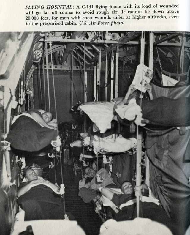 FLYING HOSPITAL:A C-141 flying home with its load of wounded will go far off course to avoid rough air. It cannot be flown above 28,000 feet, for men with chest wounds suffer at higher altitudes, even in the pressurized cabin. U.S. Air Force photo.