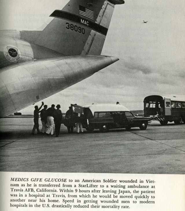 MEDICS GIVE GLUCOSE to an American Soldier wounded in Vietnam as he is transferred from a StarLifter to a waiting ambulance at Travis AFB, California. Within 9 hours after leaving Japan, the patient was in a hospital at Travis, from which he would be moved quickly to another near his home. Speed in getting wounded men to modern hospitals in the U.S. drastically reduced their mortality rate.