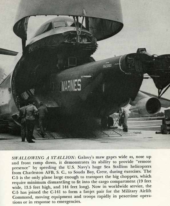 By the time the StarLifter production line shut down in February, 1968, the workhorse plane had taken us a long way along the road to an airlift capability sufficient to our needs. There were limits of performance, though, beyond which it could not go. One last step into the future was needed-an even bigger, more versatile plane, which would team with the 141 to form an airlift fleet of hitherto undreamed of performance-one that would let us fulfill our commitments to the friendly nations we are pledged to protect, while at the same time withdrawing our standing armies from their soil.