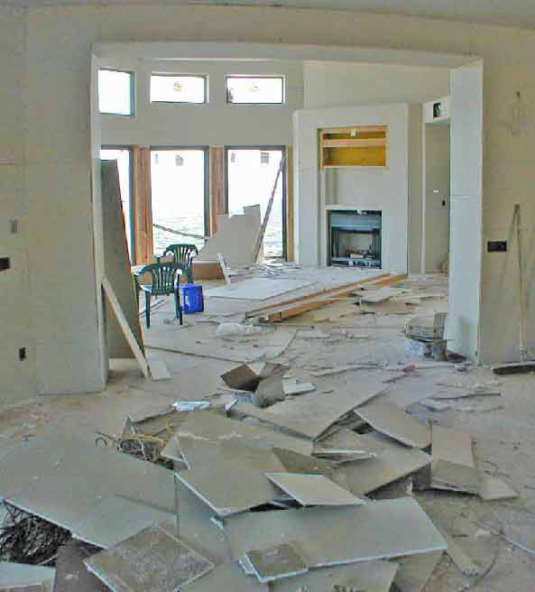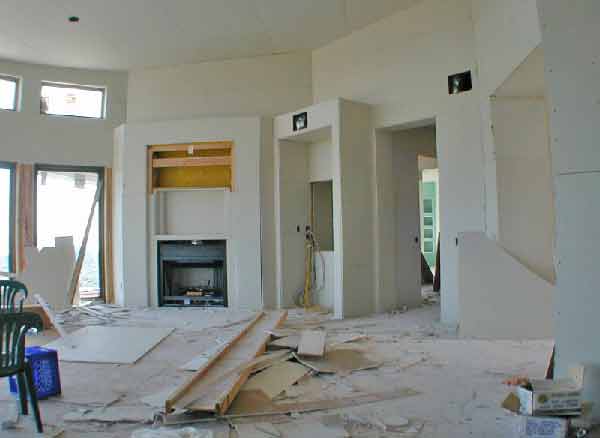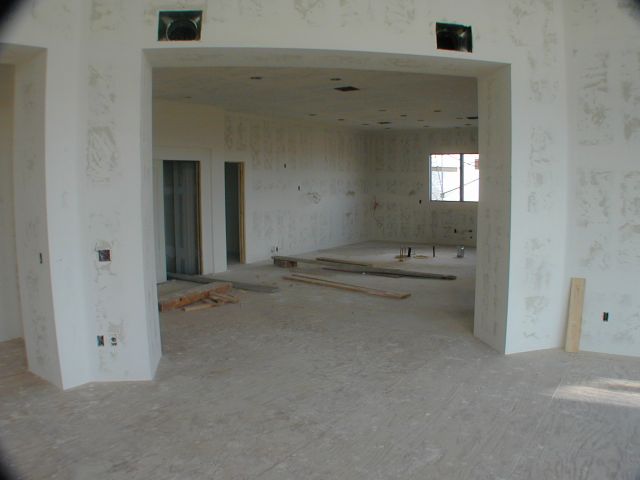 A view of the great room area with the fireplace and 'plasma hole' above it. You can see a few of the thousands of