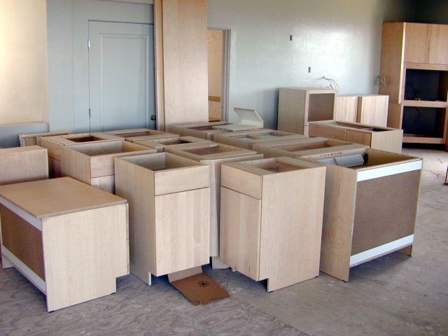 A gaggle of kitchen cabinets have arrived and assembled themselves all in a row, waiting installation.