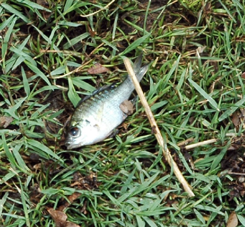 Mike found lots of future fertilizer on the 18th green. Many were still alive, so he picked them up and threw them back in the water, where they will be washed downstream to an uncertain fate. There were many of them there, all about 1 and 1/2 inches long, so they were not suitable for sushi.